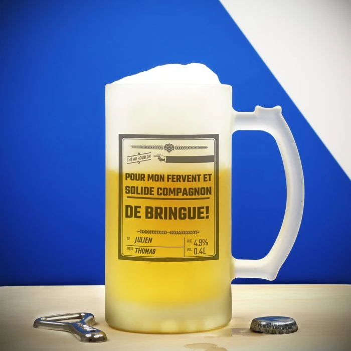 Sa prise en main grâce au design original de sa poignée, ses finitions façon verre dépoli et surtout – surtout – sa personnalisation, font d’elle un objet élégant que tout homme – ou femme – aimerait recevoir. Avec cette Chope en verre Personnalisable décidez du message inscrit, selon la personne à qui vous l’offrez et de l’occasion. Unique en son genre, n’oubliez également pas d’y faire figurer votre nom ainsi que celui de votre acolyte. Famille, collègue ou compagnon de bar, il n’aura qu’une envie : trinquer avec vous le plus vite possible pour vous remercier.