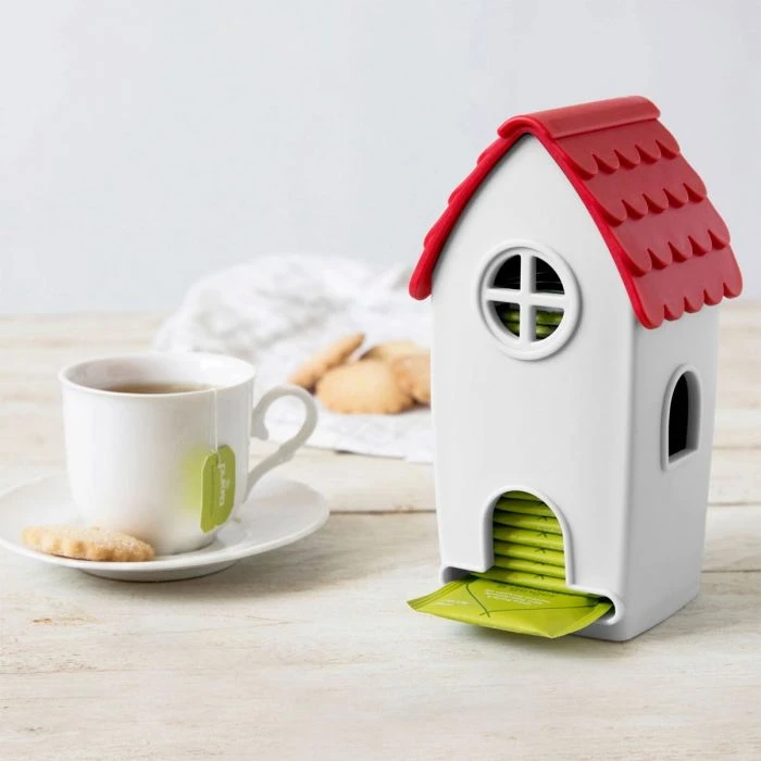 Bien sûr, vous pouvez également laisser les sachets de thé dans leur boîte ou en pagaille au fond d’un tiroir. Cet accessoire est un gadget pratique et design à placer dans sa cuisine, sur la table du petit déjeuner ou du goûter. Pour placer les sachets, il suffit de soulever le toit, pour les récupérer, de les tirer un à un par la porte de la maison. Quand tout est bien rangé et joliment présenté, on double le plaisir, n’est-ce pas ? Cette maison, distributeur de sachets de thé peut contenir toute une boîte de sachets.