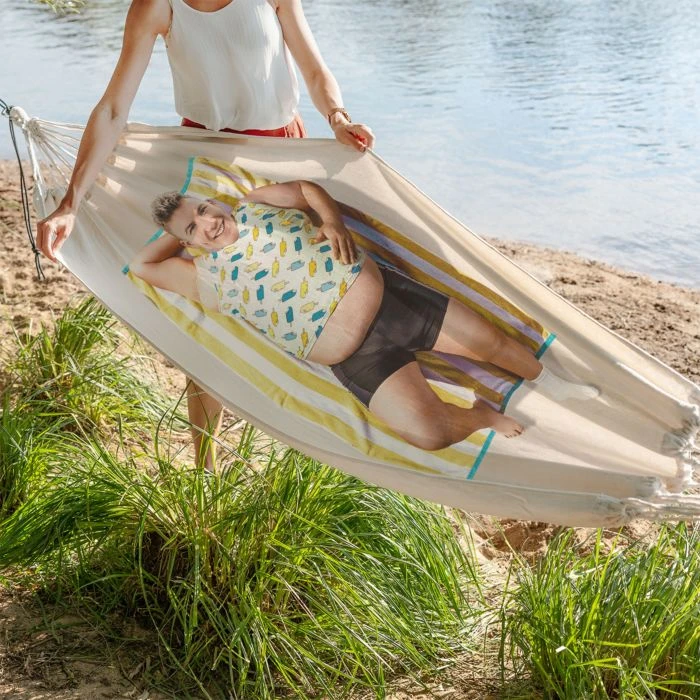 Ceux et celles qui aiment se suspendre dans un hamac le savent bien : il n’y a presque rien de mieux pour profiter d’une chaude journée d’été avec une légère brise (et tout ce qui va avec) et laisser son corps et son âme s’évader. Le bon vieux hamac est prédestiné à cette dernière activité, ne serait-ce que par sa construction ; d’autant plus si, comme dans notre cas, on peut le personnaliser avec une photo de son visage.