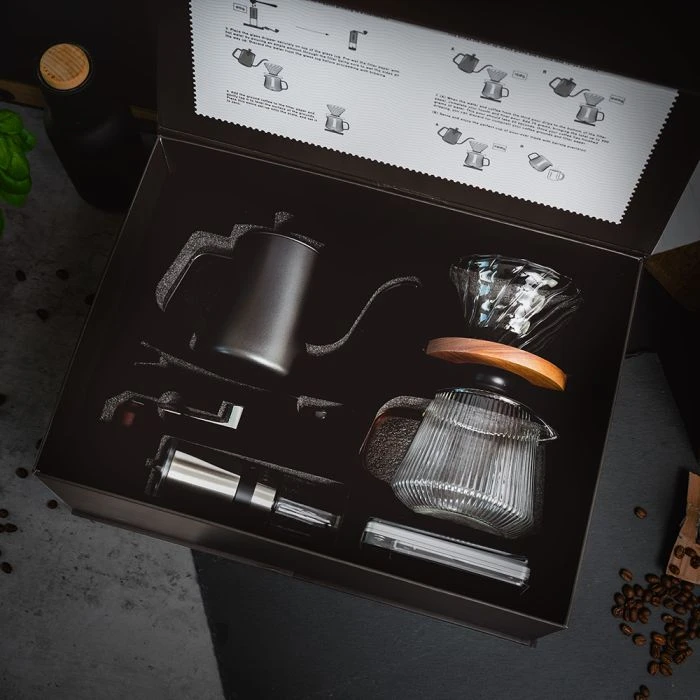 - Comprend une cafetière, une carafe à eau, un filtre en verre, une balance, un moulin à café et une cuillère à mesurer.