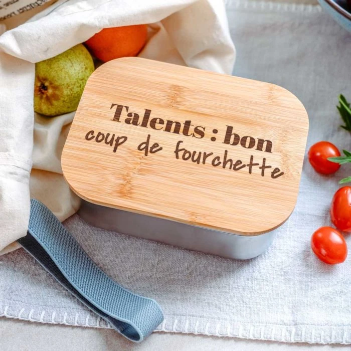 Inutile de vous rappeler l’utilité d’une lunchbox – que nos ancien·nes appelaient aussi « boîte à casse-croûte », car elle était à l’origine destinée à accueillir exclusivement ce repas rapide du même nom. Nous n’avons pas besoin de vous dire non plus qu’à l’école, à la fac ou au bureau, il est toujours utile d’avoir quelque chose de pas cher et fait maison à grignoter. À mettre donc dans notre lunch box personnalisée avec texte, en acier inoxydable solide et couvercle en bambou, sur laquelle vous pouvez faire graver soigneusement ce que vous voulez.