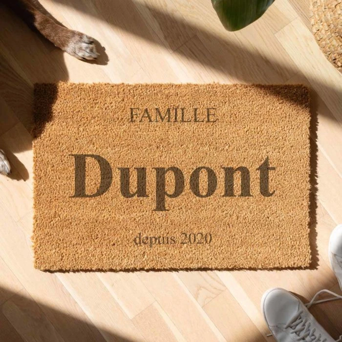 Voici ce qui manquait encore à votre entrée (ou celle d’un·e ami·e) : un paillasson personnalisé en fibres de coco avec dessous antidérapant et sur lequel votre nom ou texte est gravé (oui, oui, vous avez bien lu, gravé, pour que ça tienne longtemps). Grâce à lui, on sait à présent à qui appartient cette modeste demeure et en même temps, les invité·es ne ramènent plus toute leurs saletés à l’intérieur…