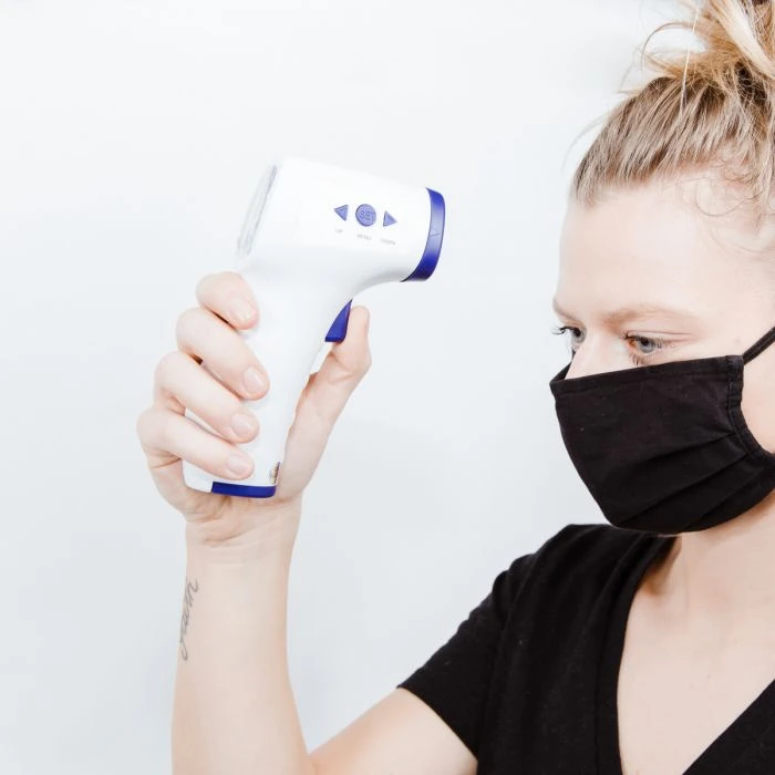 - La température corporelle est mesurée sans contact au niveau de la peau (front)